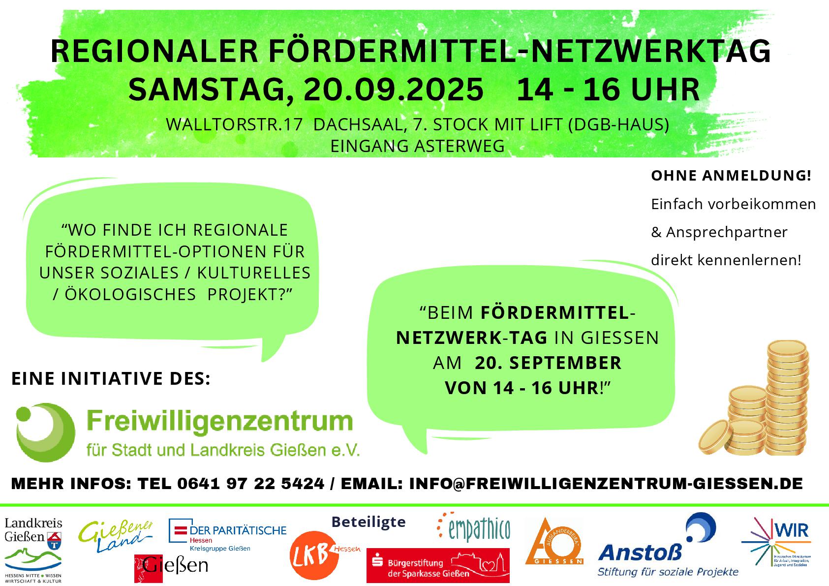 Es ist wieder so weit: Unser alljährlicher Netzwerktag zum Kennenlernen regionaler Fördermittelgeber findet am Samstag den 20.9. von 14-16 Uhr statt.